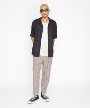 Downtown fit in stripe print, Back darts, Welt side and back pockets, Tapered and cropped leg, Recycled polyester woven labels, FSC® approved paper swing tags.