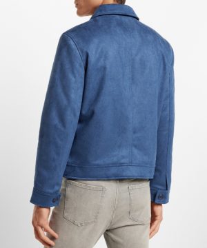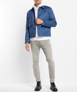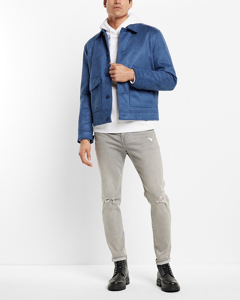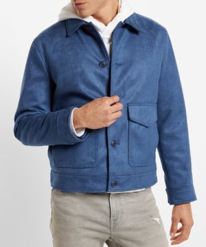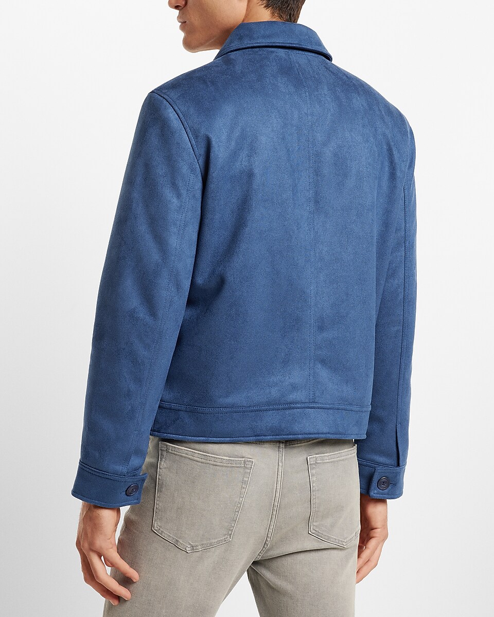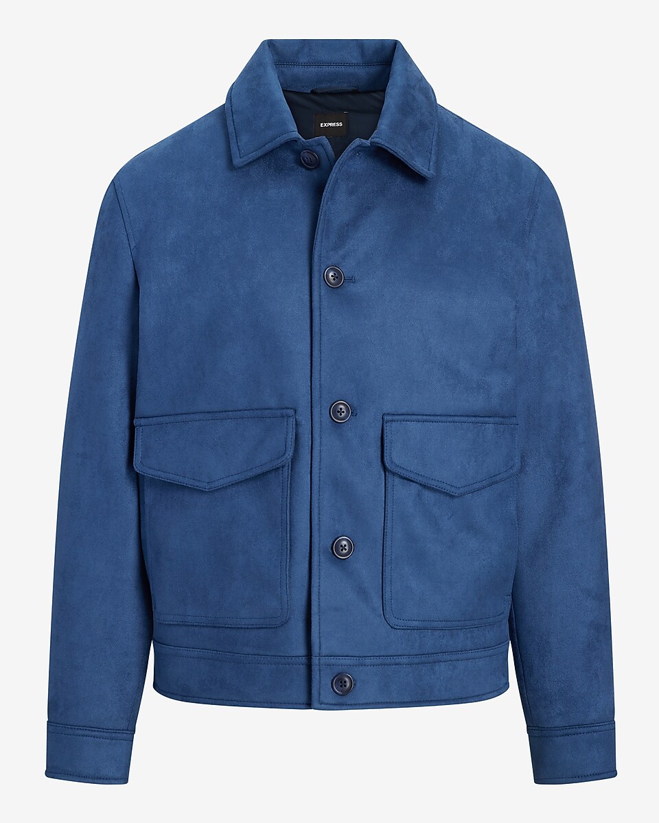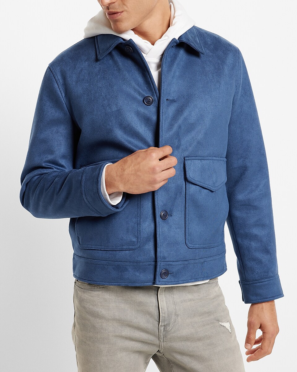 - A sleek faux suede bomber jacket with a modern button front. Perfect for layering over your tees with jeans or chinos for easy styling.