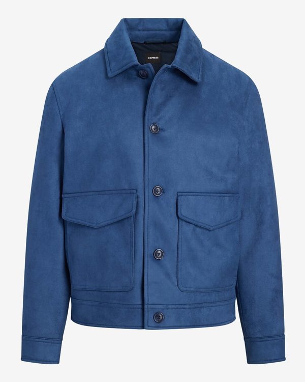 - A sleek faux suede bomber jacket with a modern button front. Perfect for layering over your tees with jeans or chinos for easy styling.