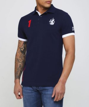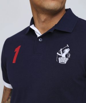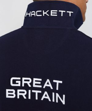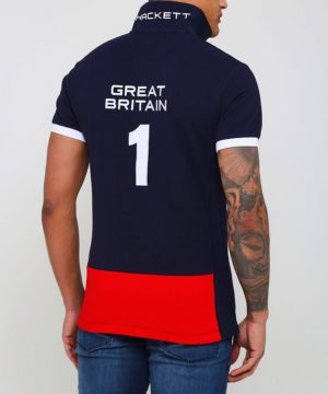 he Hackett GB polo shirt takes its inspiration from the official Great Britain polo team uniform. Crafted from a traditional pique cotton, the navy polo has been cut to a slim fit for an athletic silhouette. Featuring a flat knit collar and cuffs, two button placket and embroidery to the chest, sleeve and reverse, whilst the block coloured inner placket, cuffs and reverse hem emphasise a sporty aesthetic.