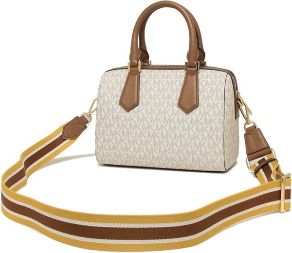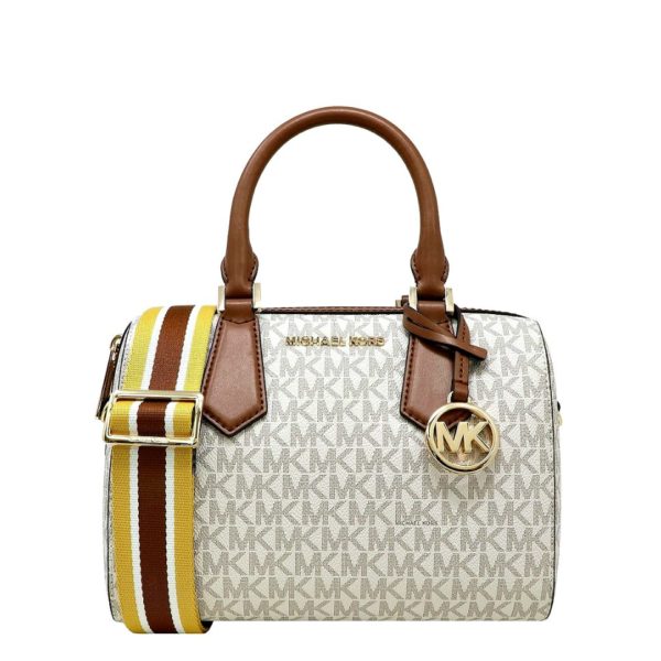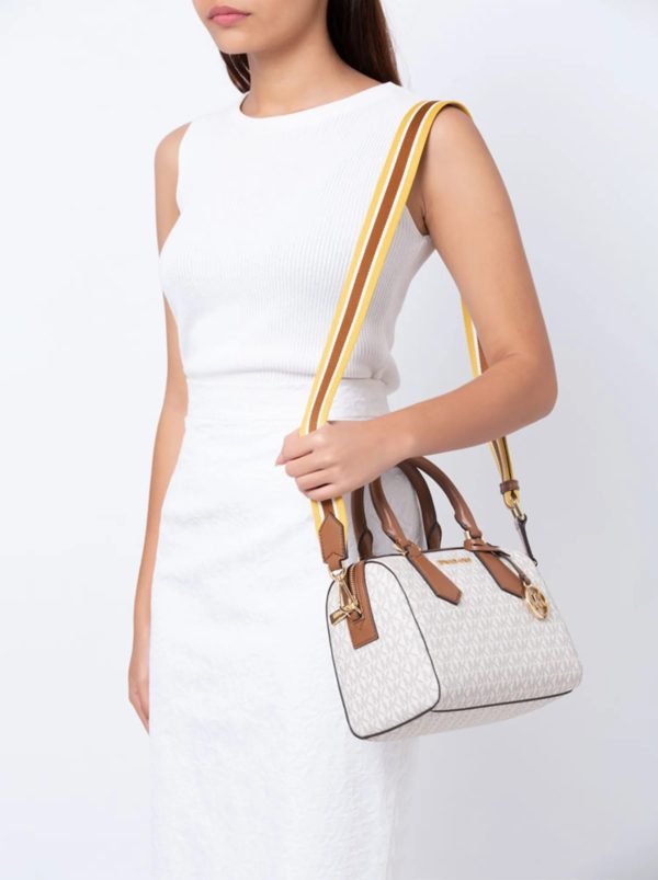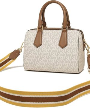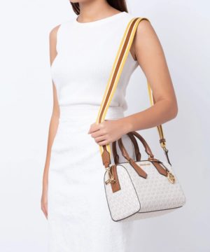 A crisp white Michael Kors Hayes bowling bag with a subtle all-over MK print. It features two short, light brown leather handles and a wide, fabric shoulder strap. Gold Michael Kors lettering and an MK keychain add signature branding.• Material:Canvas 90%; Genuine leather 10%• Color:Beige & Brown• Size S/M/L:Small• Dimensions:Length 23 cm; height 17 cm; width 13.5 cm;• Additionally:Adjustable shoulder strap 85cm – 142cm