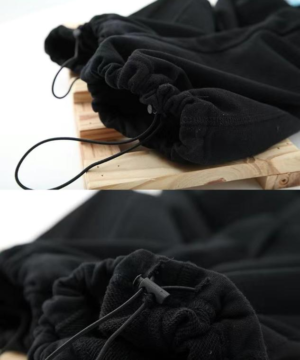 - Elastic waistband with cinched waist and drawstring for size adjustment.