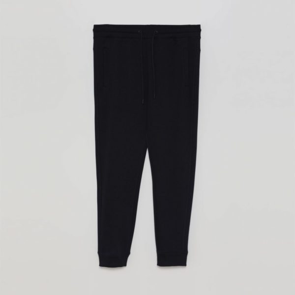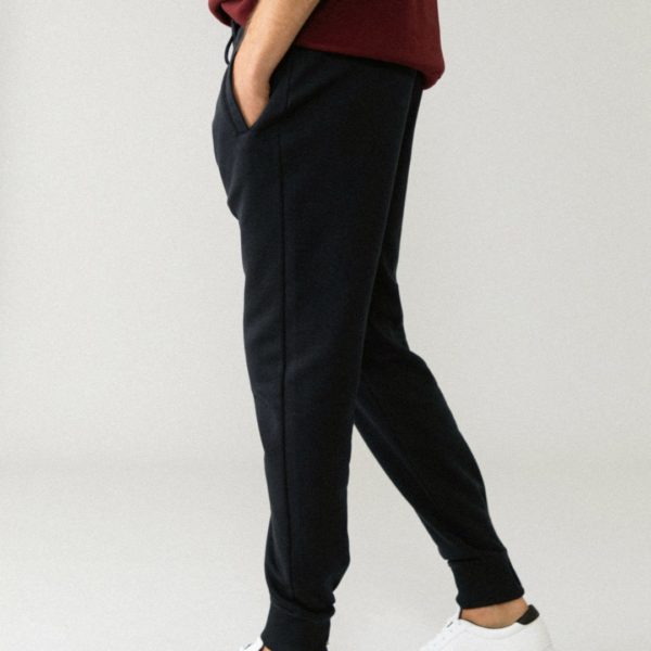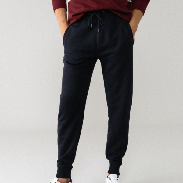 Basic trousers in a slightly tight fit, with an adjustable elasticated drawstring waistband, side pockets and a back pocket. With elastic ribbed cuffs for greater mobility. The fabric has a soft brushed finish on the interior, providing comfort and warmth. This garment is perfect for sports as well as for daily wear.