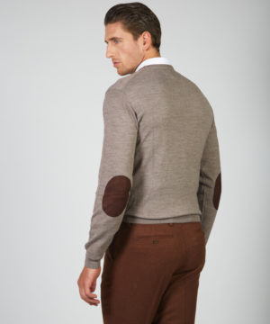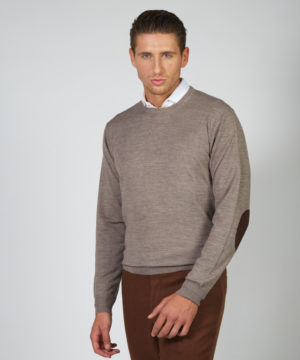 - Crew-neck sweater in merino wool with suede patches on the elbows. Ribbed finishes on collar, cuffs and hem.