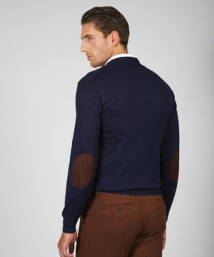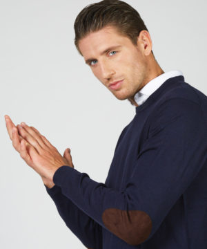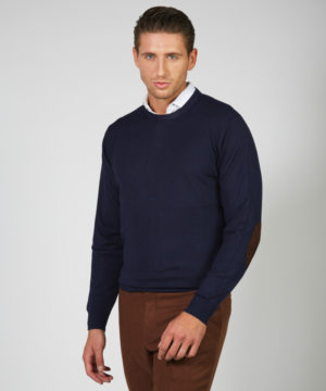 - Crew-neck sweater in merino wool with suede patches on the elbows. Ribbed finishes on collar, cuffs and hem.