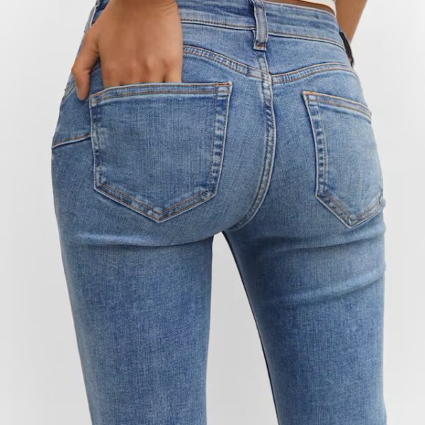 Denim style cotton fabric. Cotton-blend fabric. Elastic. Long design. Skinny fit. Low waist. Five pockets. Loops. Zip and one button fastening. Inseam 74 cm. Plus Size Available.
