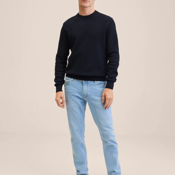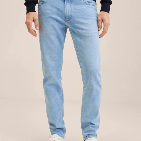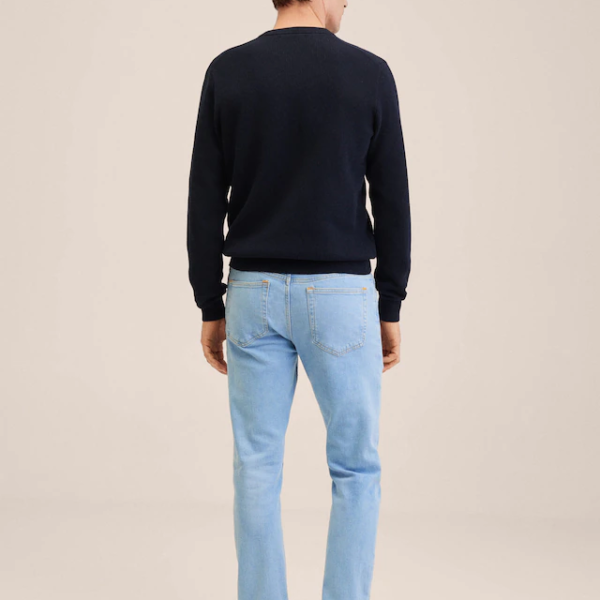 Slim fit. Sustainable cotton blend fabric. Light wash. Loops. Two side pockets. Coin pocket. Two patch pockets on the back. Zip and one button fastening. These trouser is available in sizes with an extra length of 5 cm in order to maintain the original fit whatever your height is. The model is 185 cm tall and is wearing a size 42.