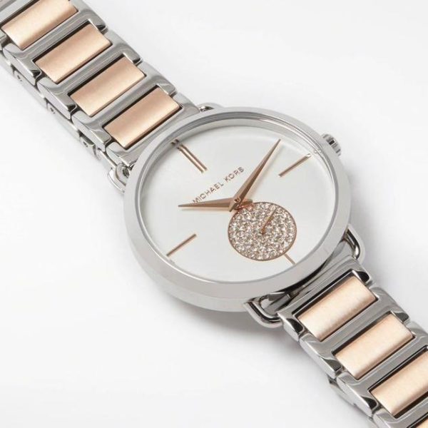 Stainless steel case with a two-tone (silver and rose gold-tone) stainless steel bracelet. Fixed stainless steel bezel. Silver dial with rose gold-tone hands. Index markers at the 3, 6, 9 and 12 o’clock positions. Dial Type: Analog. Crystal-set seconds sub-dial. Quartz movement. Scratch resistant mineral crystal. Pull / push crown. Solid case back. Round case shape, case size: 37 mm, case thickness: 6 mm. Band width: 16 mm. Deployment clasp with a push button release. Water resistant at 50 meters / 165 feet. Functions: hour, minute, second. Additional Info: in general, suitable for short periods of recreational swimming, but not diving or snorkeling. Dress watch style. Michael Kors Portia Silver Dial Two-tone Watch MK3709.