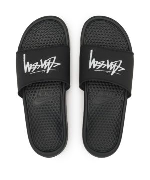 Stüssy and Nike classic Nike Benassi slide with screenprinted deboss “Stüssy” stock logo across strap.