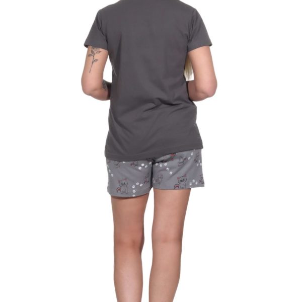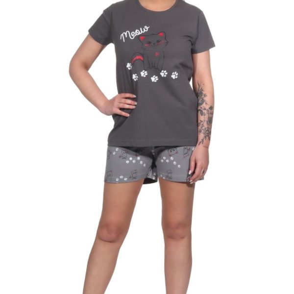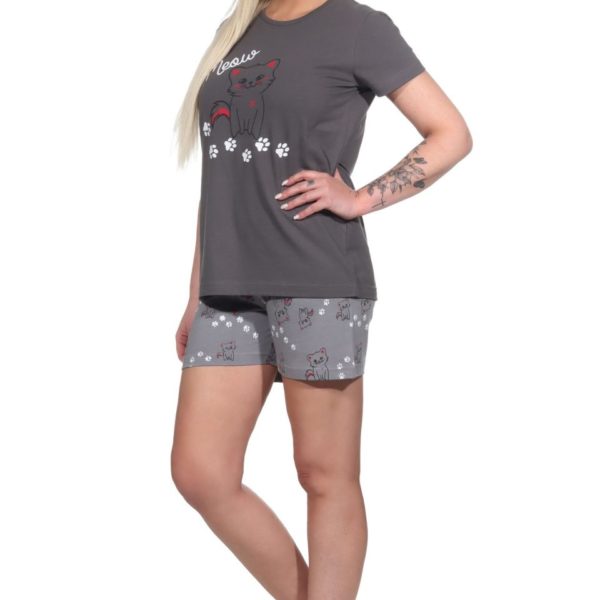 The short shorts feature a cool minimal print, which is reflected in the cat pattern of the short-sleeved top, creating a great look.