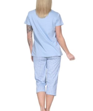 - Normann women’s short-sleeved pajama set with polka-dotted capri pajama pants.
