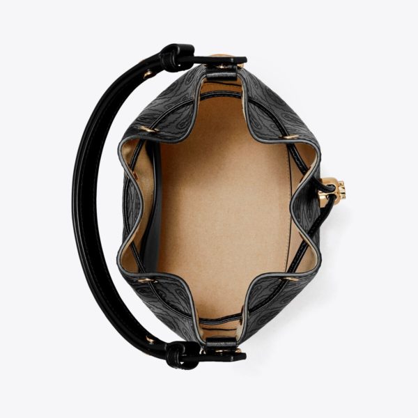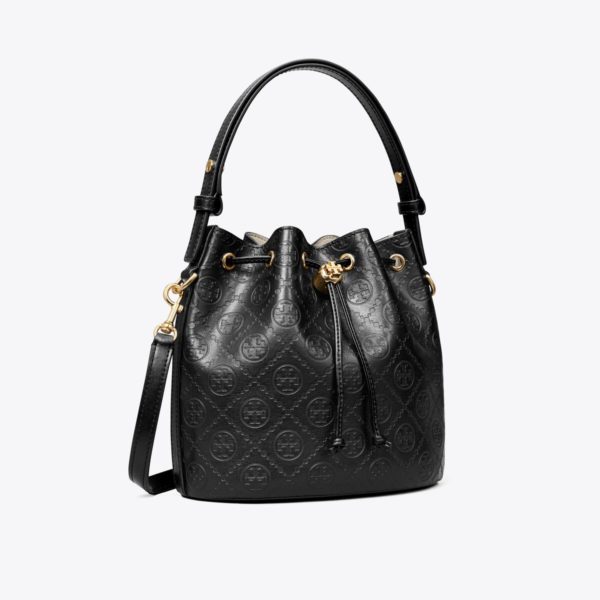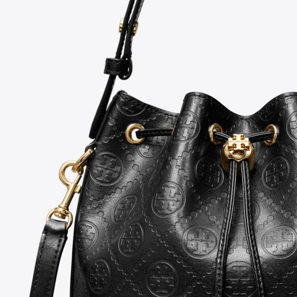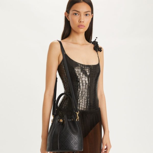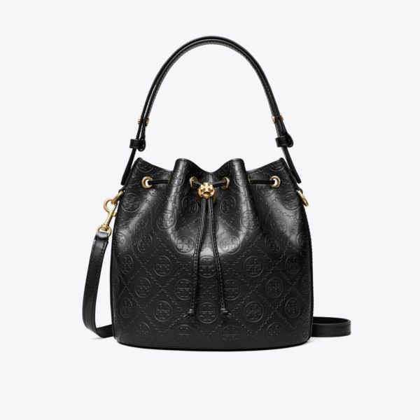 TORY BURCH T Monogram Leather Bucket Bag – Black