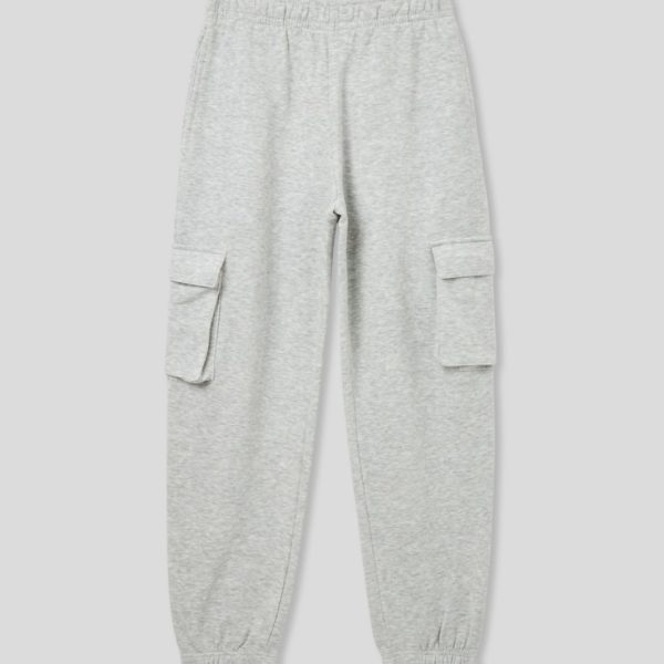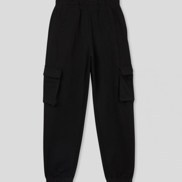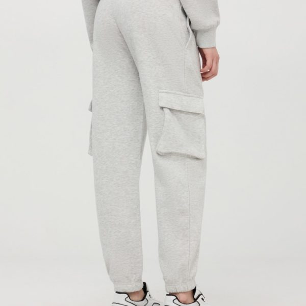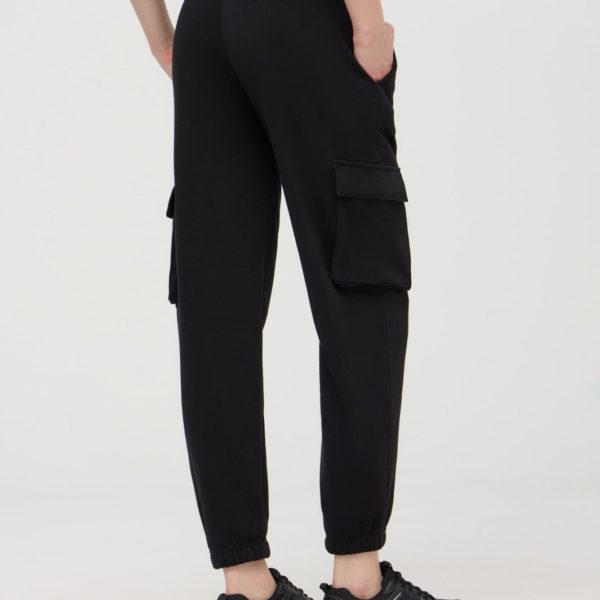 Women’s cargo trousers made from heavy solid fabric. The model features two front pockets and two side cargo pockets with flaps on the leg. These trousers combine functionality and style. The fit is relaxed with elastic at the waist and ankles, making them ideal for a casual look.