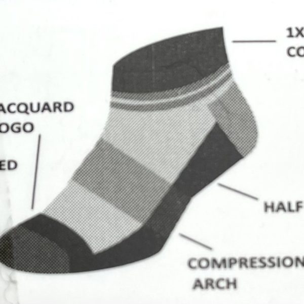 - Features half cushion sole, sport ribbed texture on leg, quad air channels, comfort toe seam, ribbed compression arch support, and extended cushion over toe cap