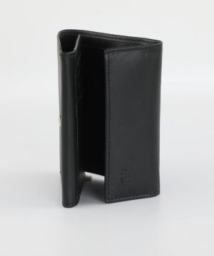Tri Fold Cow Leather Wallet With Button Closure In Plain Black
