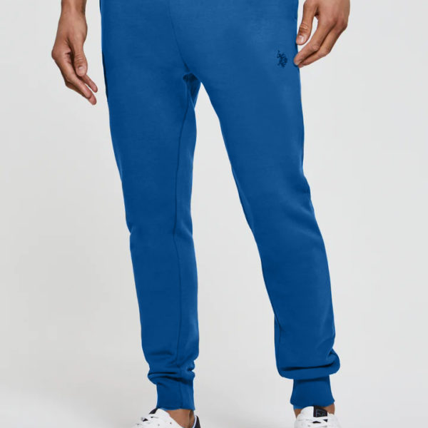 Trousers made of stretchy cotton fabric. Elastic waistband with adjustable drawstrings. Front pockets and a back welt pocket. Faded-effect. Cuffed elastic hems.